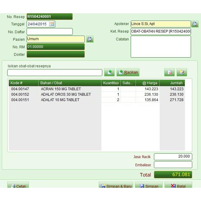 Krn ada sebagian obat ga dijual bebas tanpa resep. Berupa sistem informasi pengelolaan stok obat pada apotek joint farma. Ubah persentase embalase (jika diperlukan). T = tuslah ( besaran balas jas pelayanan farmasi). Embalase (harga wadah pembungkus obat dan peralatan lain, misalnya plastik, salinan resep) t = tuslah ( merupakan besaran balas jasa pelayanan farmasi ).